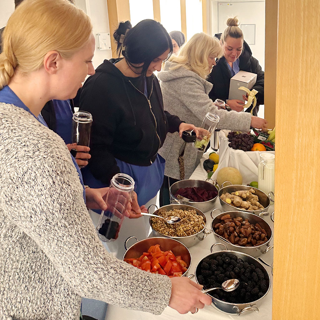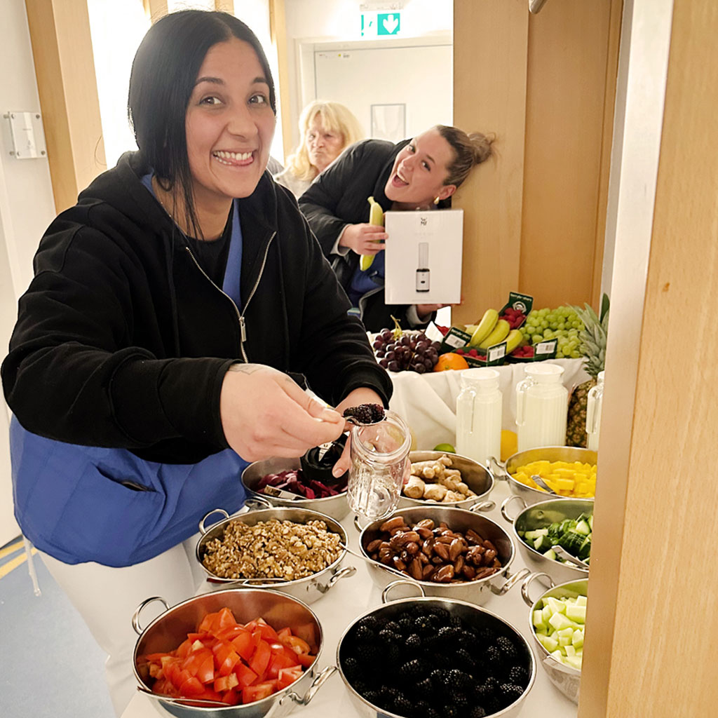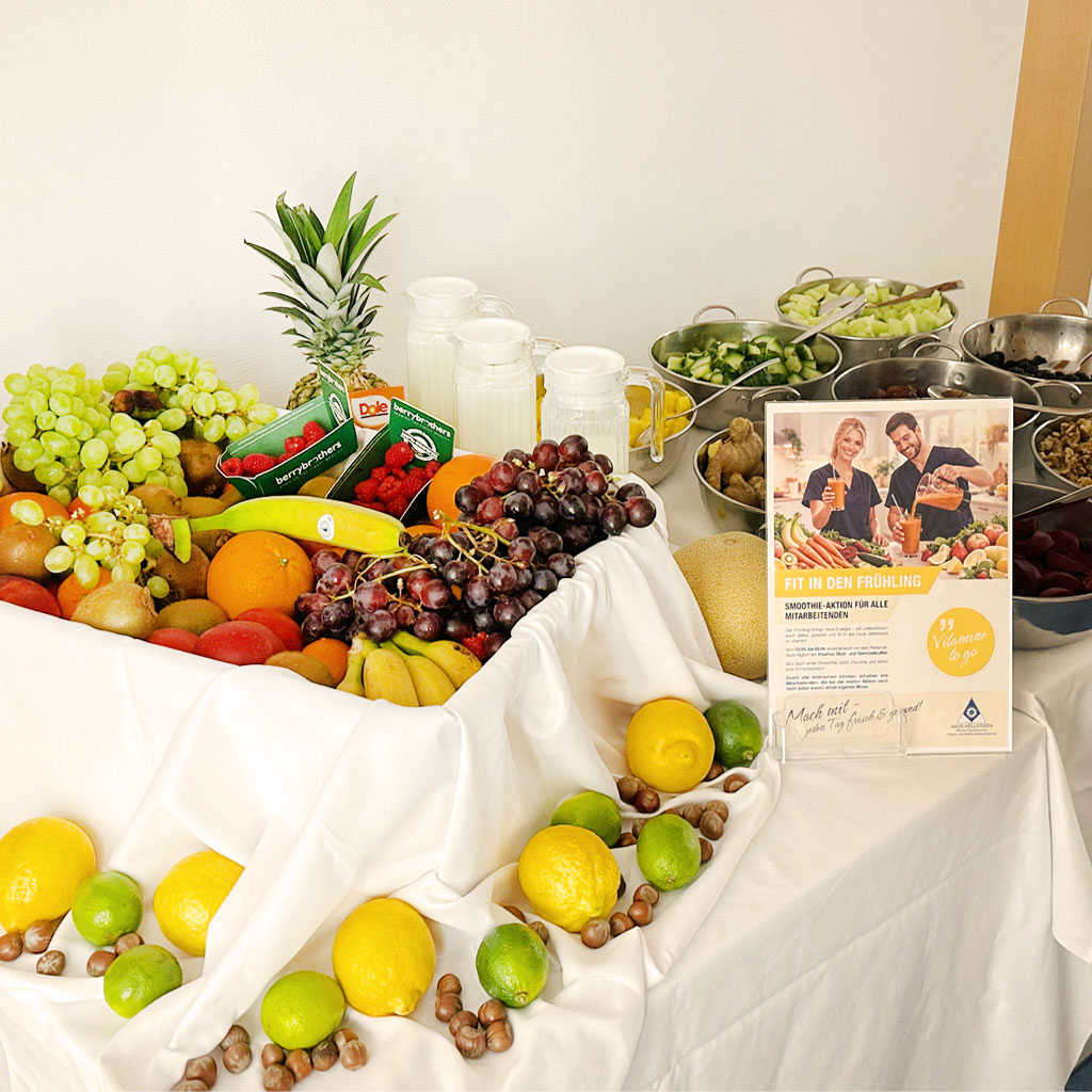 Im Mittelpunkt steht dabei ein täglich frisch bereitgestelltes Obst- und Gemüsebuffet vor dem Personalraum. Hier können sich alle Mitarbeitenden nach Belieben bedienen und ihre eigenen, individuellen Smoothies zusammenstellen. Ob vitaminreiche Früchte, knackiges Gemüse oder eine bunte Mischung – der Kreativität sind keine Grenzen gesetzt.